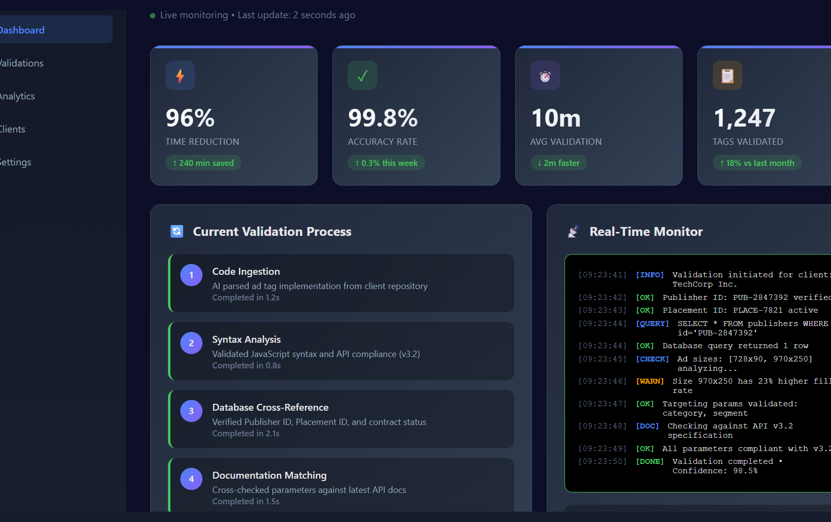 An Ad Tech company's QA team was spending up to four hours verifying each client's ad tag implementation - manually checking code against documentation and running database queries to confirm accuracy. We built an AI-powered validation workflow that automated these steps, cutting the review time down to 10 minutes while improving consistency and accuracy.